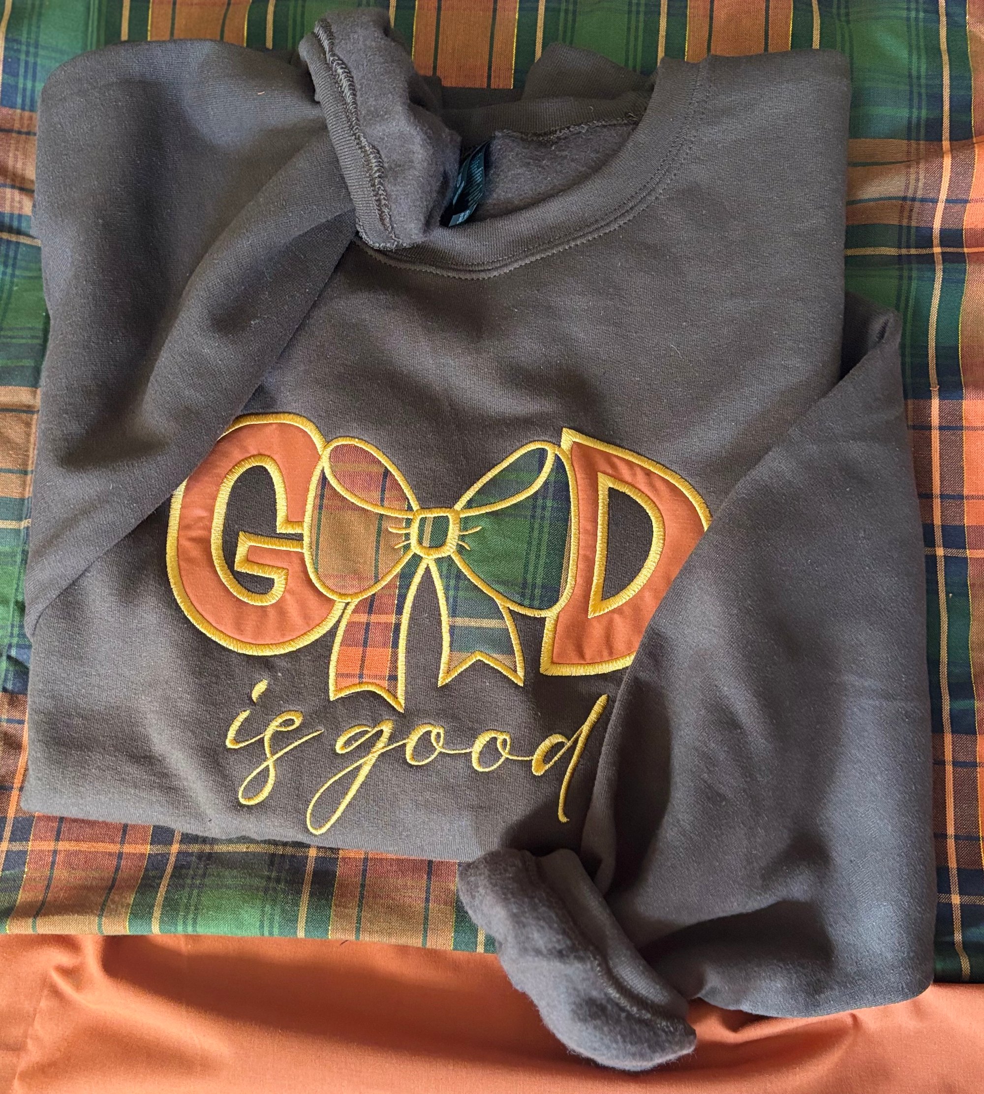 Cozy, faith-filled, and perfect for the season! This “God Is Good” sweatshirt features a rich chocolate brown base with bold appliqué lettering crafted from burnt orange and plaid fabric, adding a touch of fall charm and rustic style.
