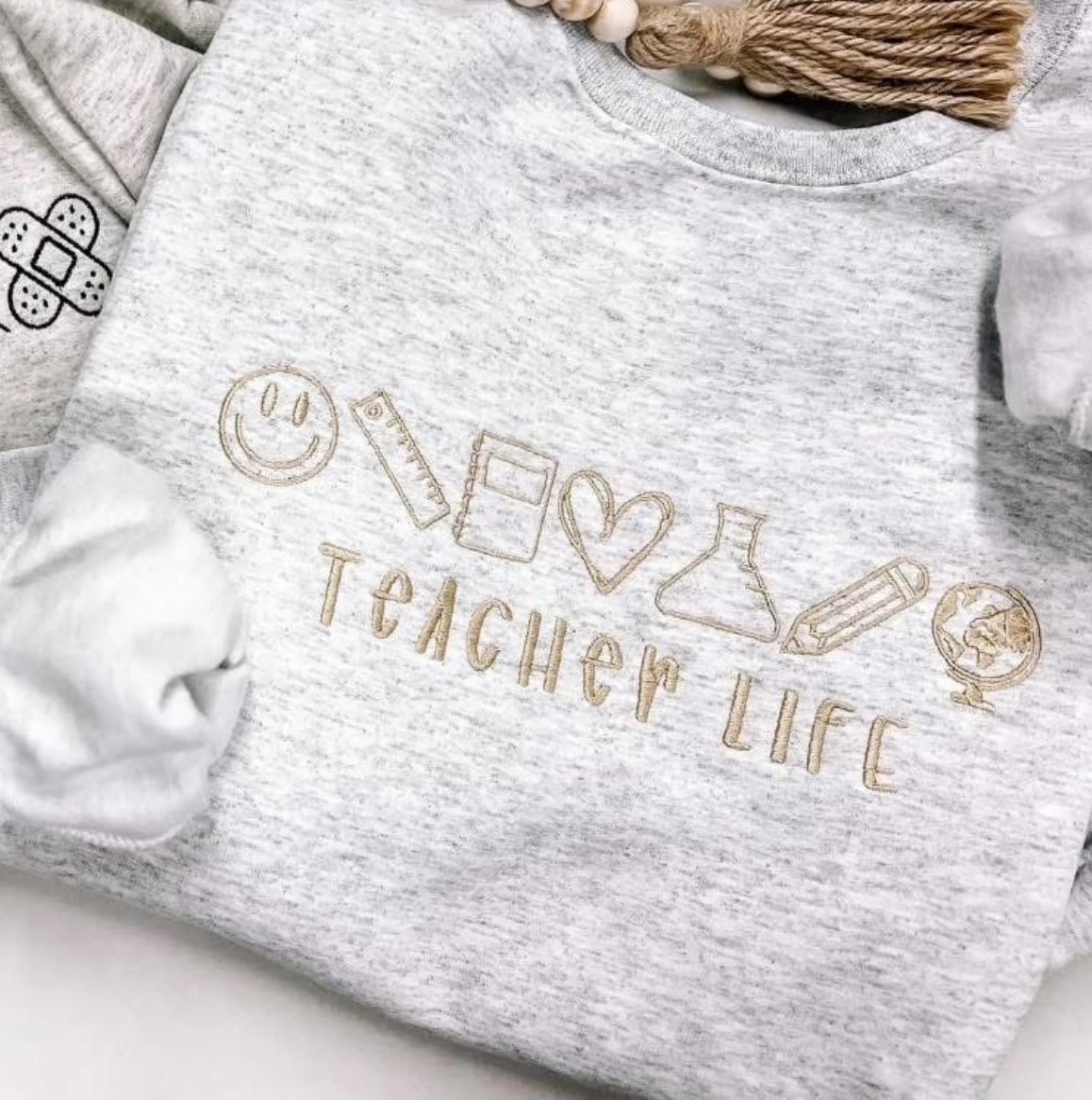 Celebrate the heart of teaching with this meaningful and stylish “Teacher” sweatshirt designed with charming educational icons that bring the word teacher to life. Featuring symbols like pencils, ruler, a notebook, etc. This sweater is the perfect blend of fun and professional.